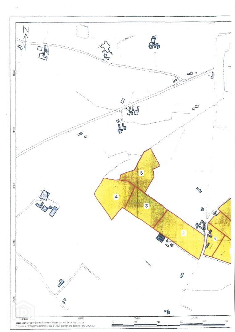 From Dromore, take the Diamond road out of the Town and travel on this road until you reach Waringsford. Before entering the hamlet of Waringsford turn right onto Enagh Road. Travel to the end of Enagh Road and turn right onto Katesbridge Road. The land is on the right-hand side, immediately after the derelict farmhouse (no. 133).