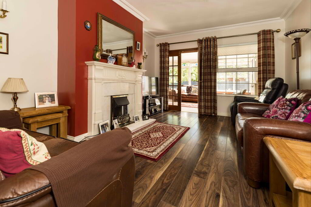 Cornicing. Wall light wiring. Feature fireplace. Laminate flooring. Glazed double doors to sun room.