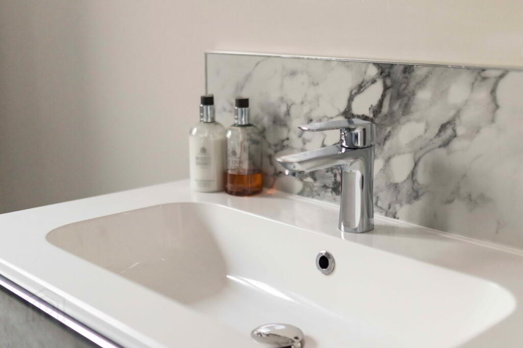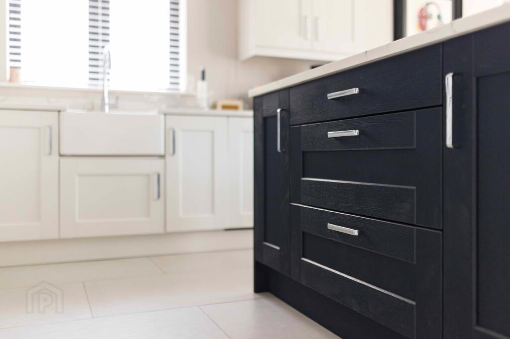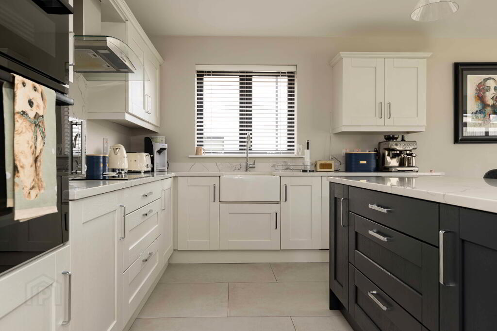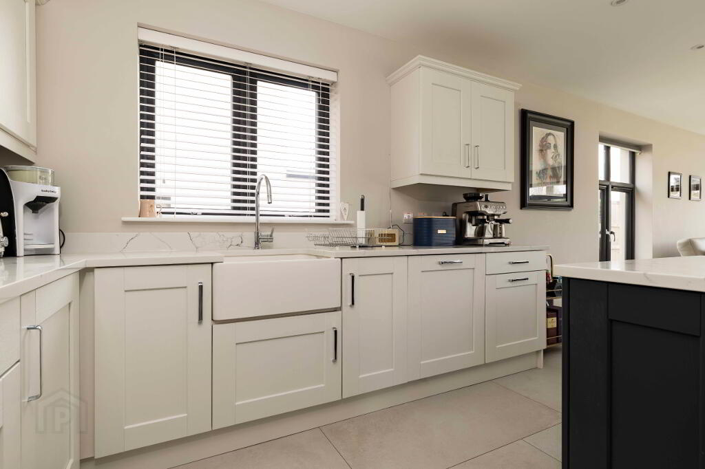 Excellent range of high- and low-level units with quartz worktops, upstands and splashback to hob. Belfast style sink with Caple mixer tap.