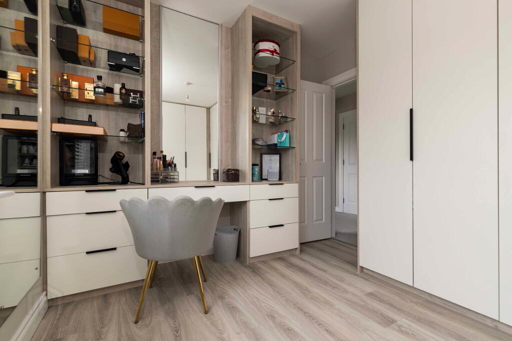 Extensive range of built in wardrobes, with dressing table/make up area and display shelving.