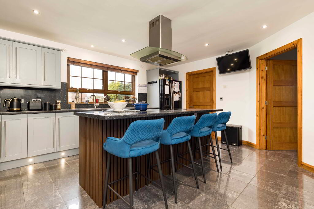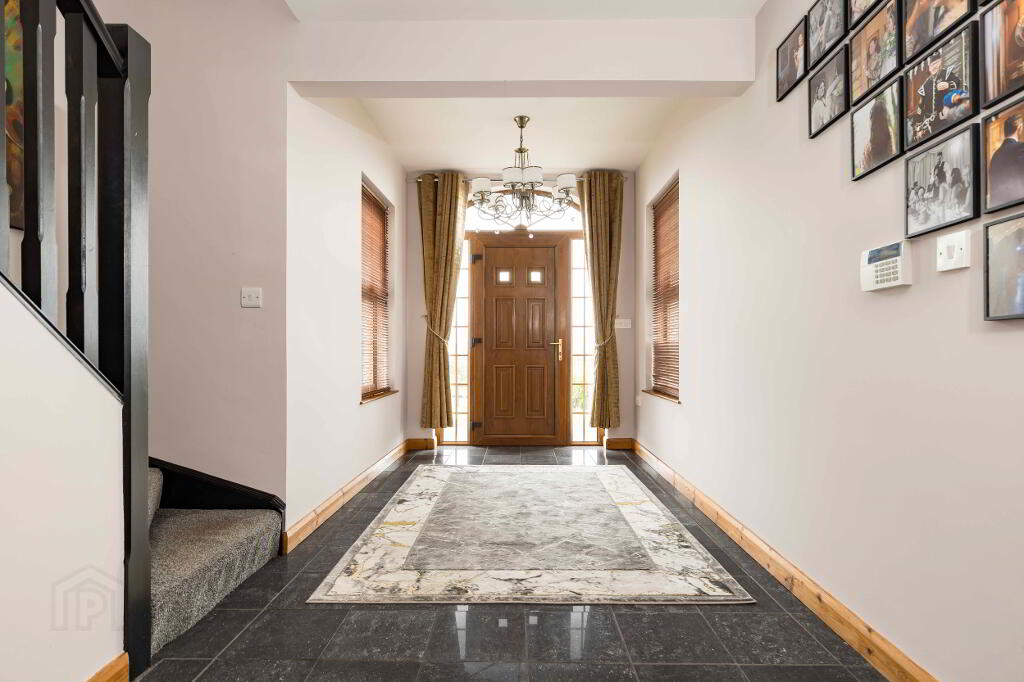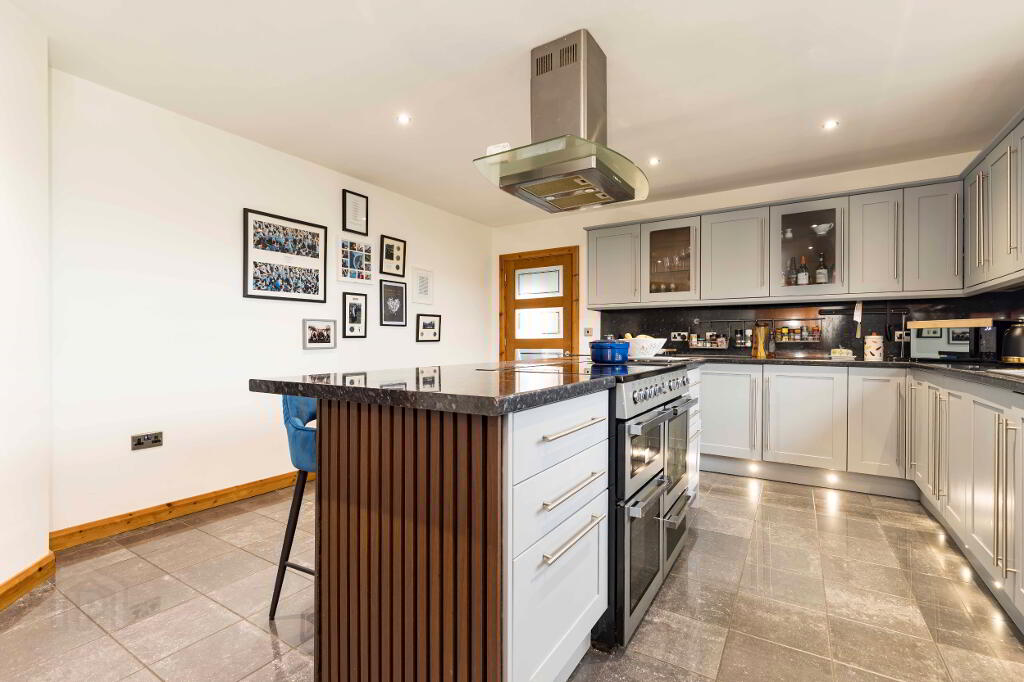 The front-facing living room boasts breathtaking Mourne Mountain views and a striking media wall with display shelving, perfect for relaxing or entertaining. At the heart of the home, the kitchen with island unit flows seamlessly to a separate dining room, creating a social hub ideal for meals and gatherings.
