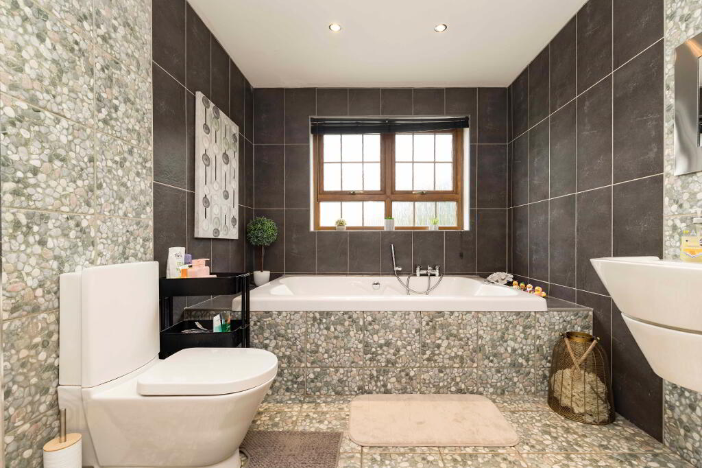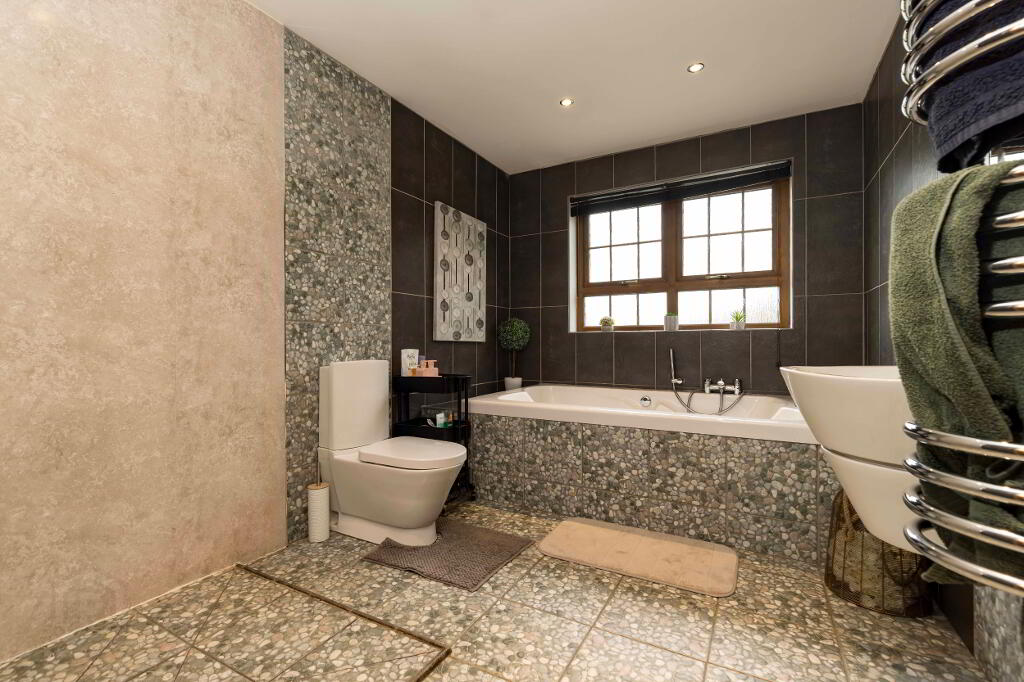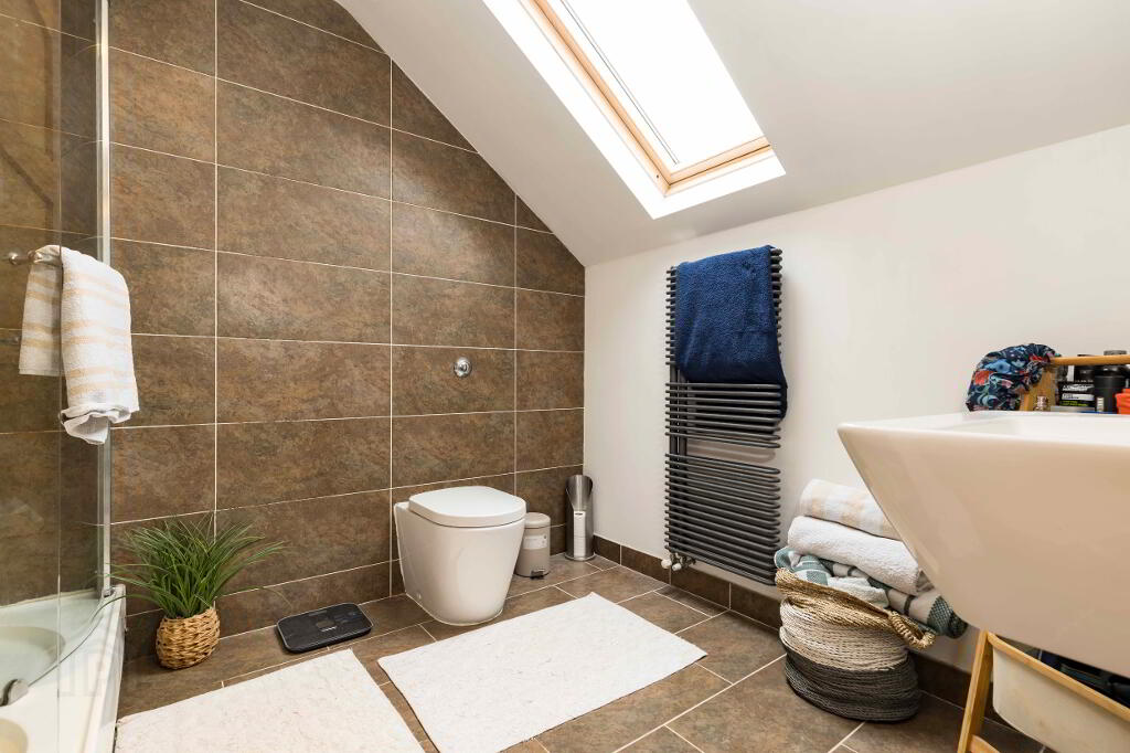 Ensuite. WC, wash hand basin and bath. Heated towel radiator.