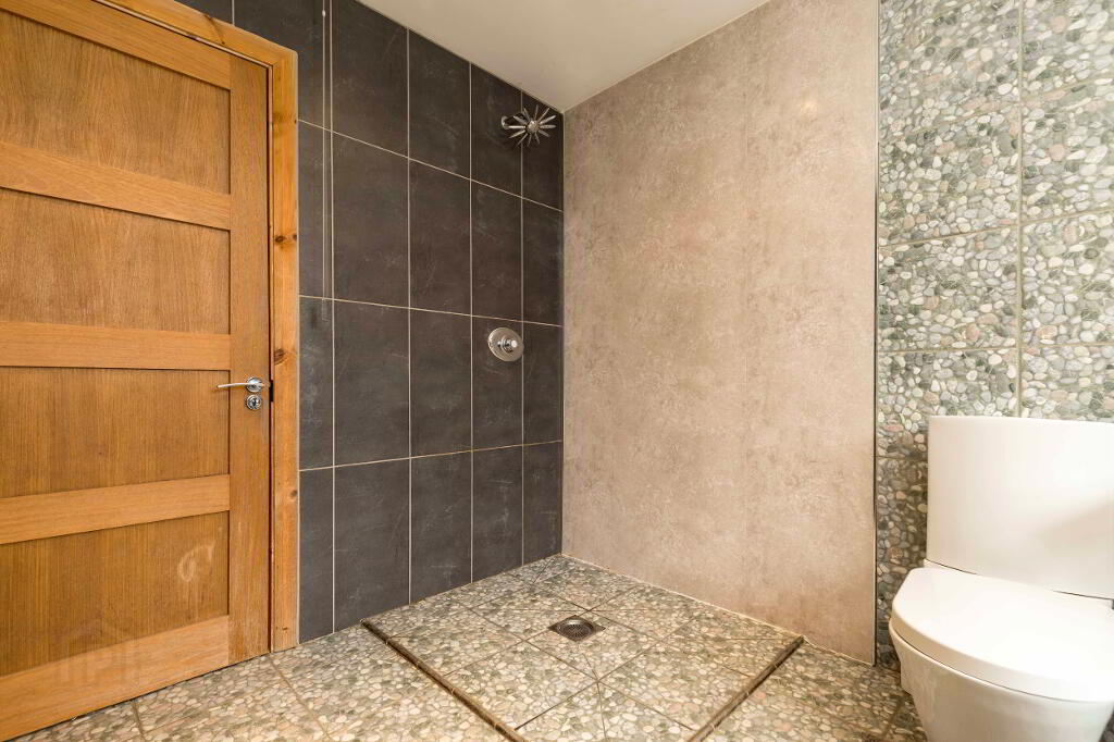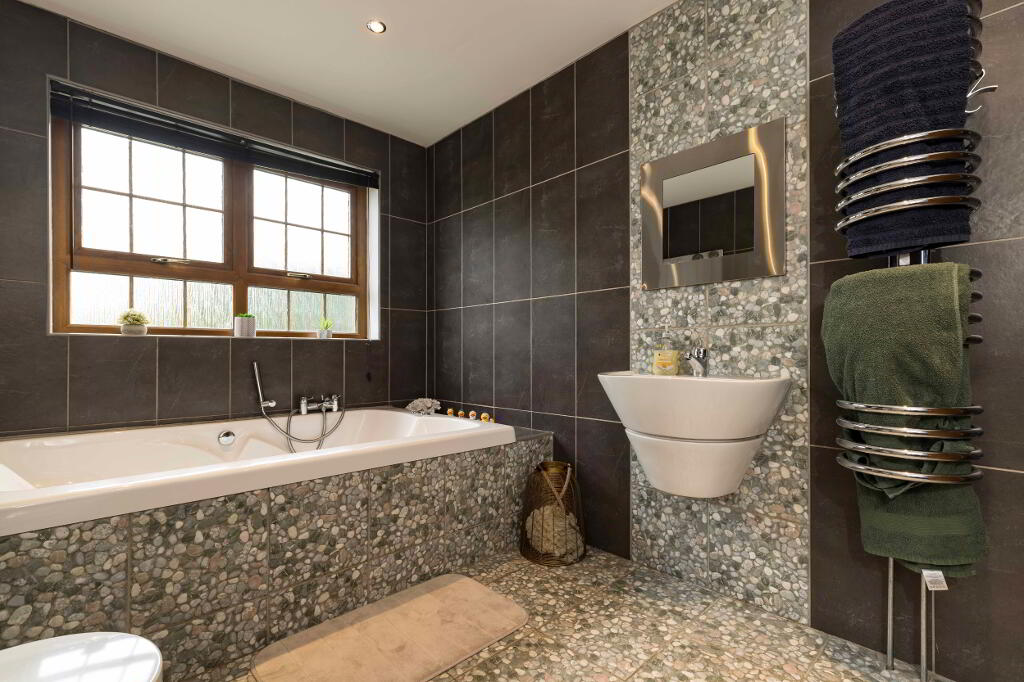 Tiled floor and tiled walls. Feature heated towel radiator.
