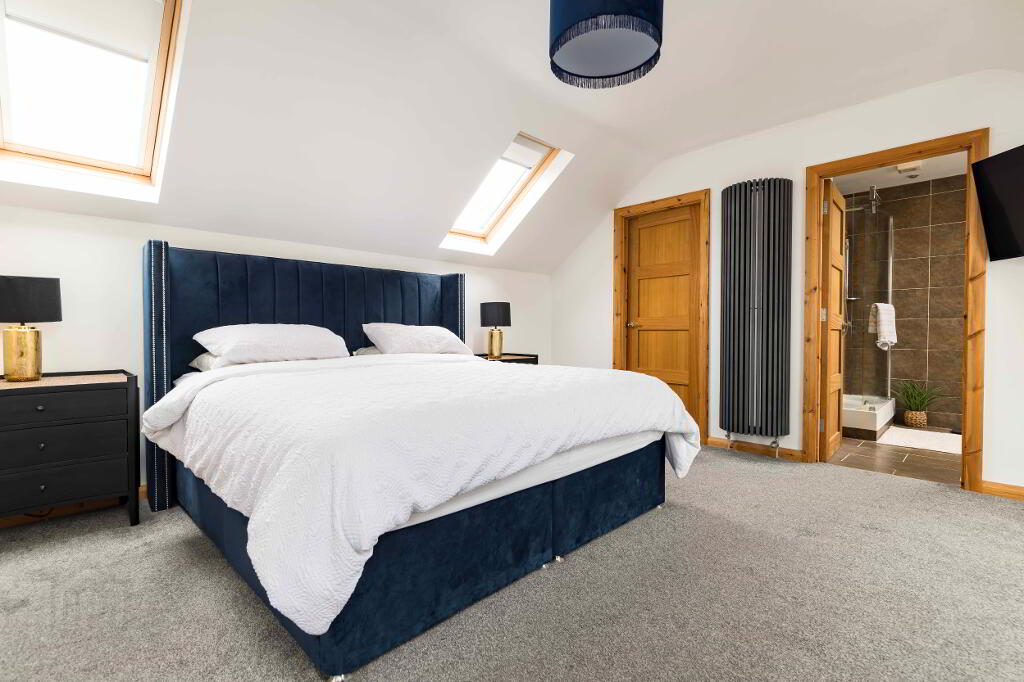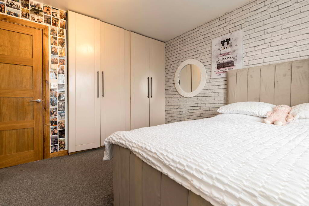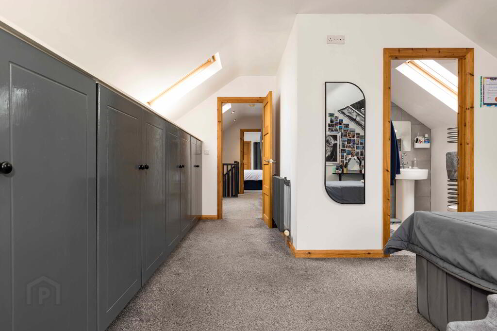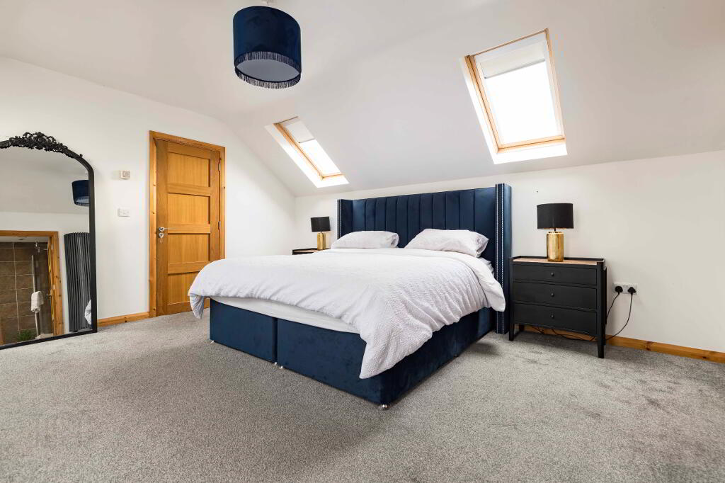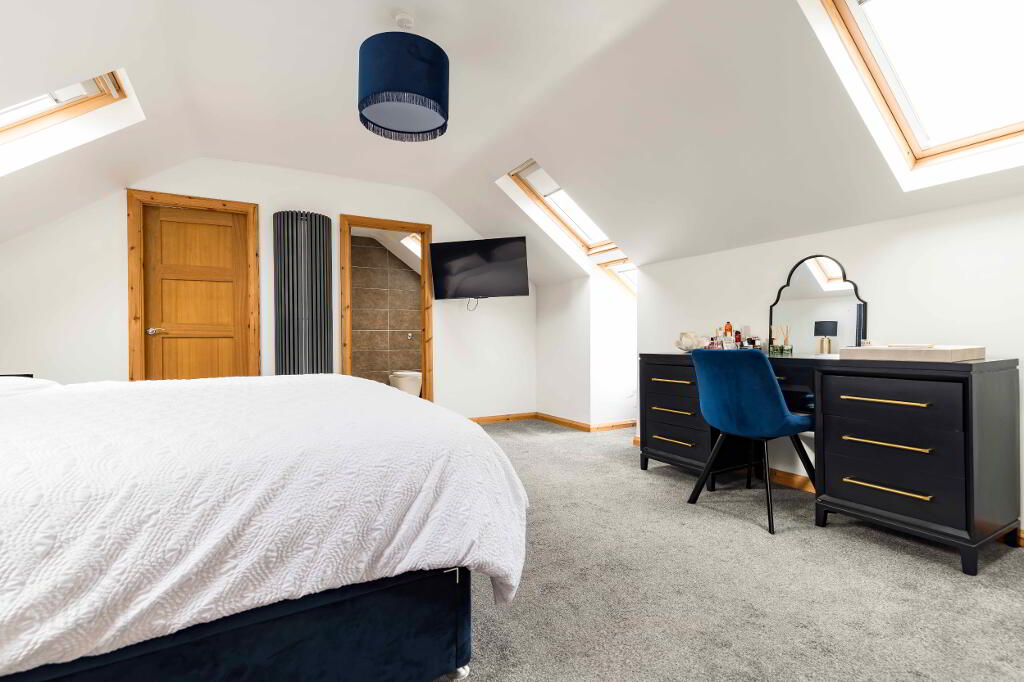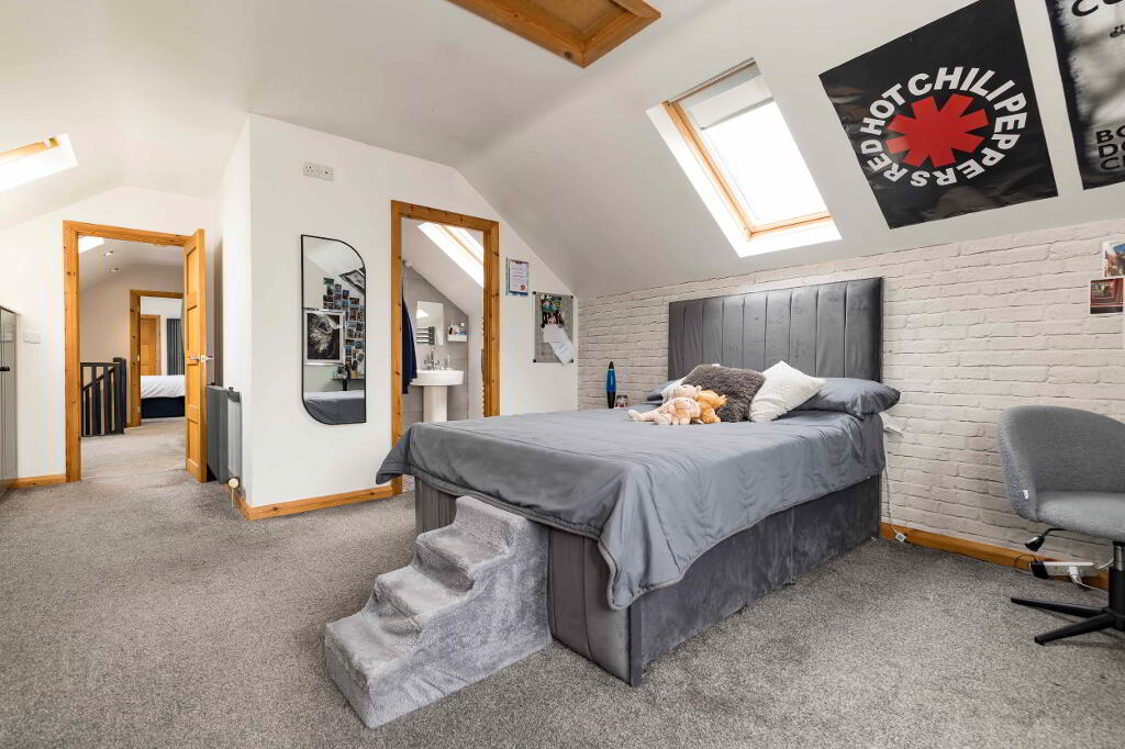 Bedroom With Shared Ensuite. 14’6 extending to 19’6 at widest point x 12’9. Or 4.47m x 3.94 ext. 6.02m. Eaves storage.