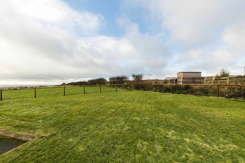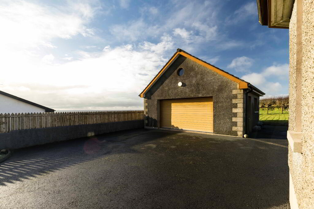 Outside, the gardens are mainly laid to lawn and low-maintenance, while a detached garage with storage provides essential practicality.