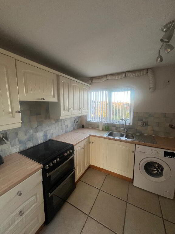 Kitchen. Range of high and low level units. Sink unit. Electric cooker with extractor hood. Washing machine and fridge. Part tiled walls and floor.