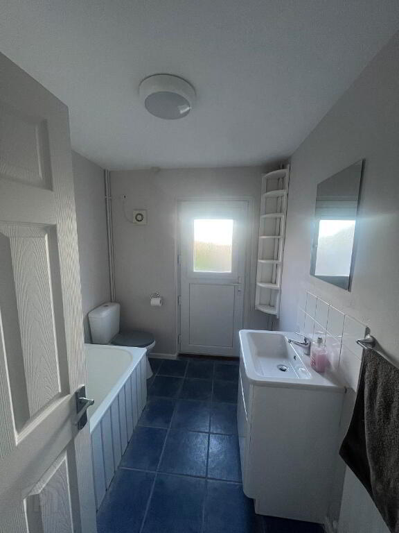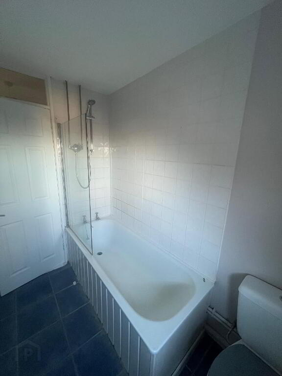 Bathroom. White suite comprising of WC, bath with electric shower over & wash hand basin. Part tiled walls and floor.