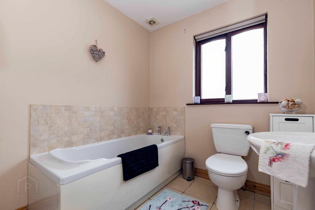 Bathroom. White suite comprising of WC, pedestal wash hand basin & panelled bath. Tiled floor. Part tiled walls.