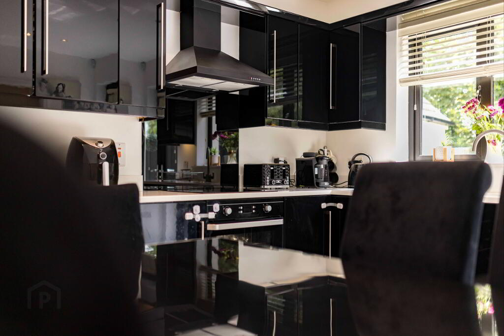 Modern Kitchen. 13’4 x 11’9. (4.07m x 3.65m) Comprehensive range of high and low level gloss units with quartz worktops and upstands. Sink with mixer tap. Electric oven and induction electric hob with extractor above. Integrated dishwasher. Undercounter lighting and kick board lighting. Tiled floor. Storage cupboard. Dining space.