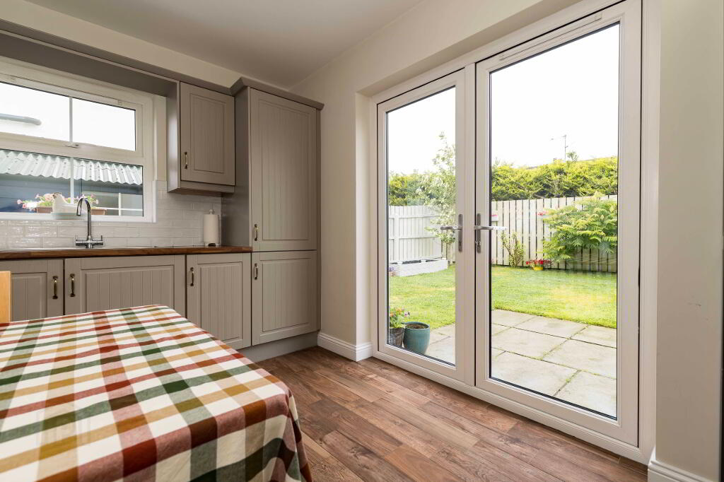 Extensive range of high and low level units with feature glazed display units. Sink unit with mixer tap. Electric oven & Gas hob with extractor hood and fan above. Integrated Fridge Freezer & Dishwasher. Tiled floor and Part tiled walls. Space for dining table. Tiled floor and part tiled walls. Patio doors to rear garden