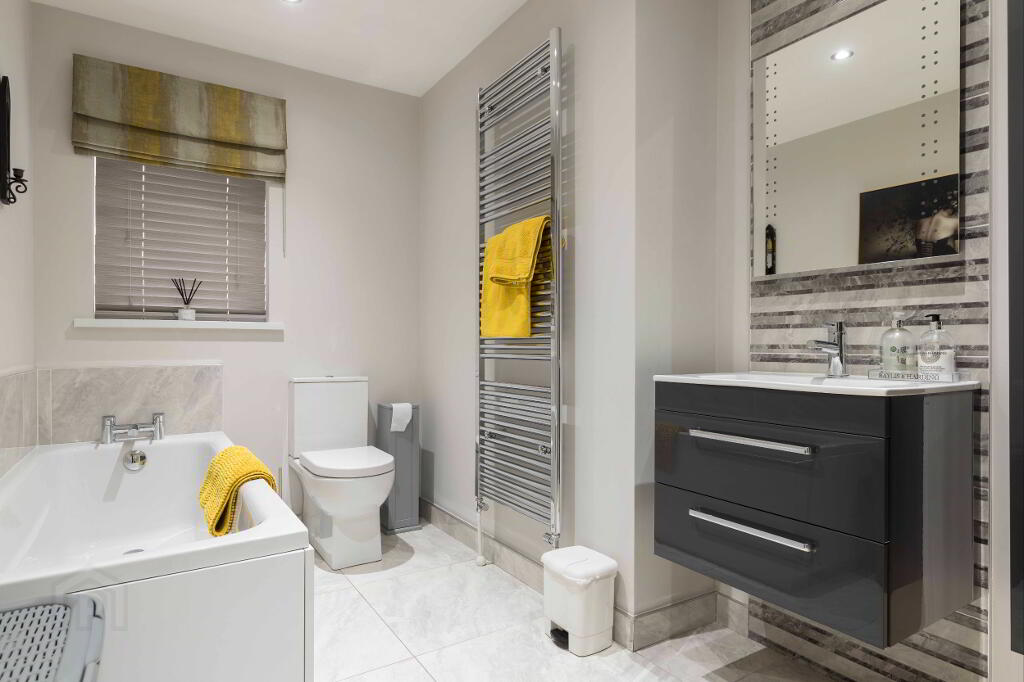 Bathroom White suite comprising of walk in “wet room” style tiled shower, WC, Wash Hand Basin in vanity unit with feature splashback, panelled bath with splashback. Tiled floor. Wired for mirror. Chrome heated towel radiator. Recessed ceiling lighting. Extractor fan.
